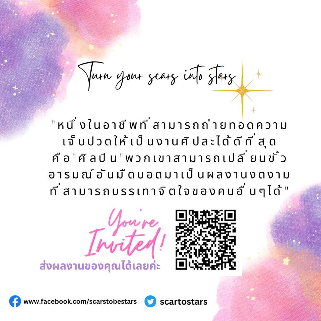 Turns Yours Scars into Stars. #แม้จะเจ็บปวดแต่มันก็งดงาม รับผลงานศิลปะทุกประเภท ไม่ว่าจะเป็น จิตรกรรม ประติมากรรม ดนตรี บทกวี เรื่องสั้น typography collage art comic art toy หรืออะไรก็ตามแต่ที่คุณสรรสร้างขึ้นมาด้วยความเจ็บปวดแต่ถ่ายทอดออกมาเป็นความงดงามได้ หนึ่งในอาชีพที่สามารถถ่ายทอดความเจ็บปวดให้เป็นงานศิปละได้ดีที่สุดคือ"ศิลปิน"พวกเขาสามารถเปลี่ยนขั้วอารมณ์อันมืดบอดมาเป็นผลงานที่บรรเทาจิตใจได้